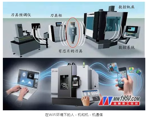 從圖中可見(jiàn),不僅人機(jī)的交互方式從控制面板延伸到移動(dòng)終端,設(shè)備和工具之間也可以進(jìn)行物與物的通信。機(jī)床的加工精度和效率在很大程度上取決于刀具的狀態(tài),如果在刀具或刀柄上嵌入芯片,就成為智能刀具。芯片不僅可以記錄在刀具預(yù)調(diào)儀上進(jìn)行調(diào)整時(shí)的數(shù)據(jù),還可以記錄刀具在機(jī)床進(jìn)行了多長(zhǎng)的切削時(shí)間,還有多少剩余壽命,可以加工幾個(gè)零件等都可以讓操作者和有關(guān)部門了如指掌,減少停機(jī)和更換刀具的時(shí)間。智能刀具及其管理的概念如上圖所示。